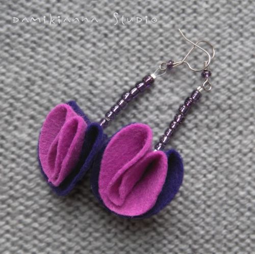 Kolczyki to kompozycja szklanych koralików z kwiatem wykonanym z filcu. Długość kolczyka wraz z biglem 7,5 cm, wielkość kwitu ok. 2,5 cm. | autor DAMIKIANNA STUDIODamikianna Studio to przymierze dwóch kobiet, ich wyobraźni, talentu i fascynacji światem.