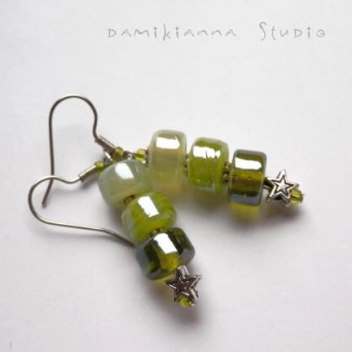 Kolczyki wykonane ze szklanych, opalizujących koralików połączona z biglami ze stali chirurgicznej (antyalergicznej).